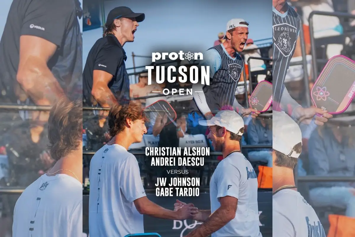 Christian Alshon and Andrei Daescu defeated Ben Johns and Hayden Patriquin in three games to reach the Proton Tucson Open final. Alshon, also competing in singles and mixed doubles finals, is chasing his first Triple Crown. They will face JW Johnson and Gabe Tardio for the championship.
