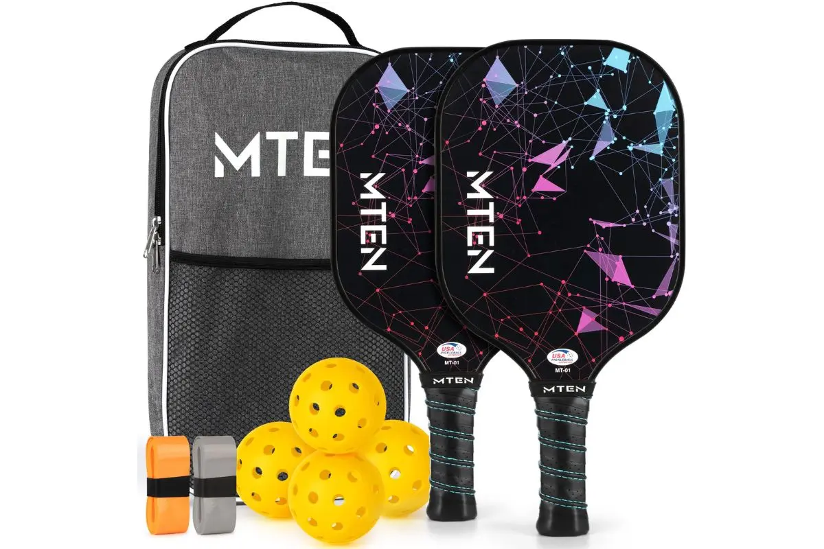 The MTEN Pickleball Paddle Set, is a beginner-friendly option featuring two paddles, four balls, and a carry bag. Lightweight, durable, and well-reviewed by thousands, it’s perfect for newcomers of all ages looking to get into the sport affordably.