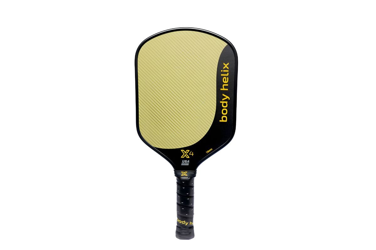 The new Body Helix Kevlar X4 paddle commands attention with its bold gold Kevlar face, which stands out under sunlight and differentiates it on the court. Featuring a poly honeycomb core, this paddle is crafted with two layers of gold Kevlar and four layers of Toray T700 carbon fiber. This combination ensures a balance of softness and pop, thanks to its hot and cold-pressed construction.