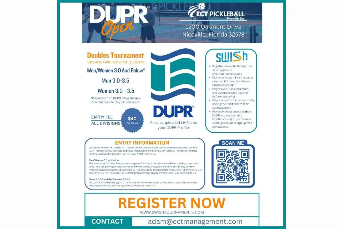 The ECT DUPR Open Tournament will take place on February 22 in Niceville, Florida. Hosted by ECT Pickleball, the event features various divisions for players. Registration is $40, and results will be uploaded live to players’ DUPR accounts. Matches begin at 11:00 AM.