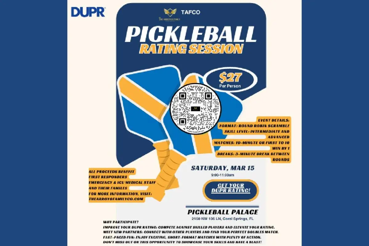The Arroyo Family Charitable Organization is hosting a DUPR Rating Session pickleball tournament on March 15, 2025, in Coral Springs, Florida. The event, benefiting first responders, offers players a chance to improve their ratings and connect with others in the pickleball community.