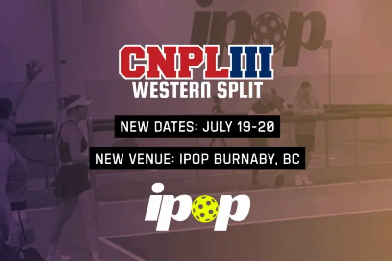 CNPL Western Split Update: The Canadian National Pickleball League (CNPL) has announced a change of date and location for the Western Split. Originally set for August 9-10 in Kamloops, British Columbia, the event will now take place on July 19-20 in Burnaby, British Columbia, due to scheduling and facility conflicts.