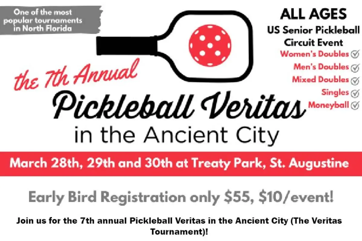 The 7th Annual Pickleball Veritas Tournament is set for March 28-29, 2025, at Treaty Park in St. Augustine, Florida. Organized by First Coast Charity Pickleball Tournaments, the event welcomes players of all ages and features various categories, including doubles and singles.