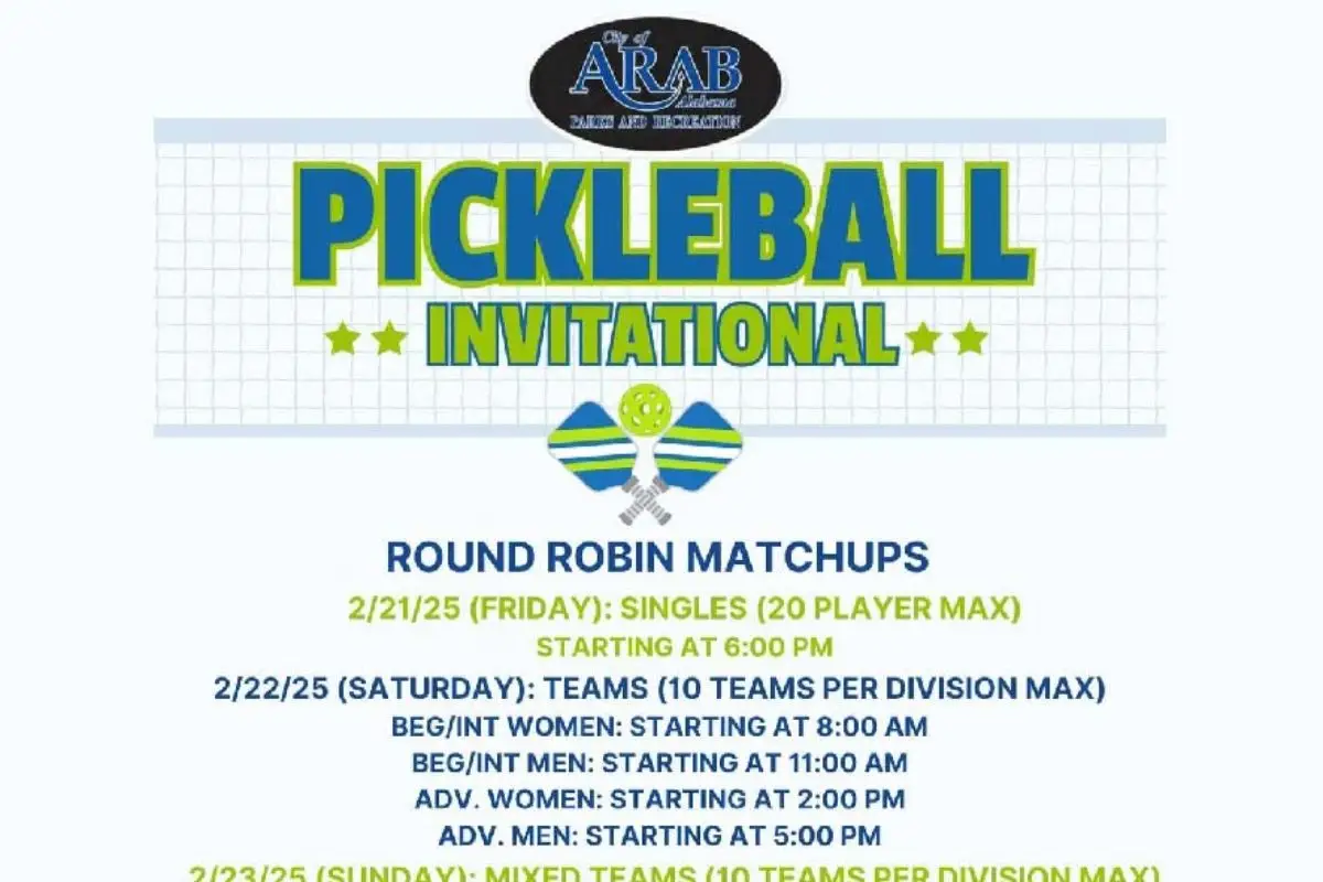 The Arab Parks and Recreation Department will host the Pickleball Invitational from February 21-23, 2025, featuring singles and team matches for all skill levels.