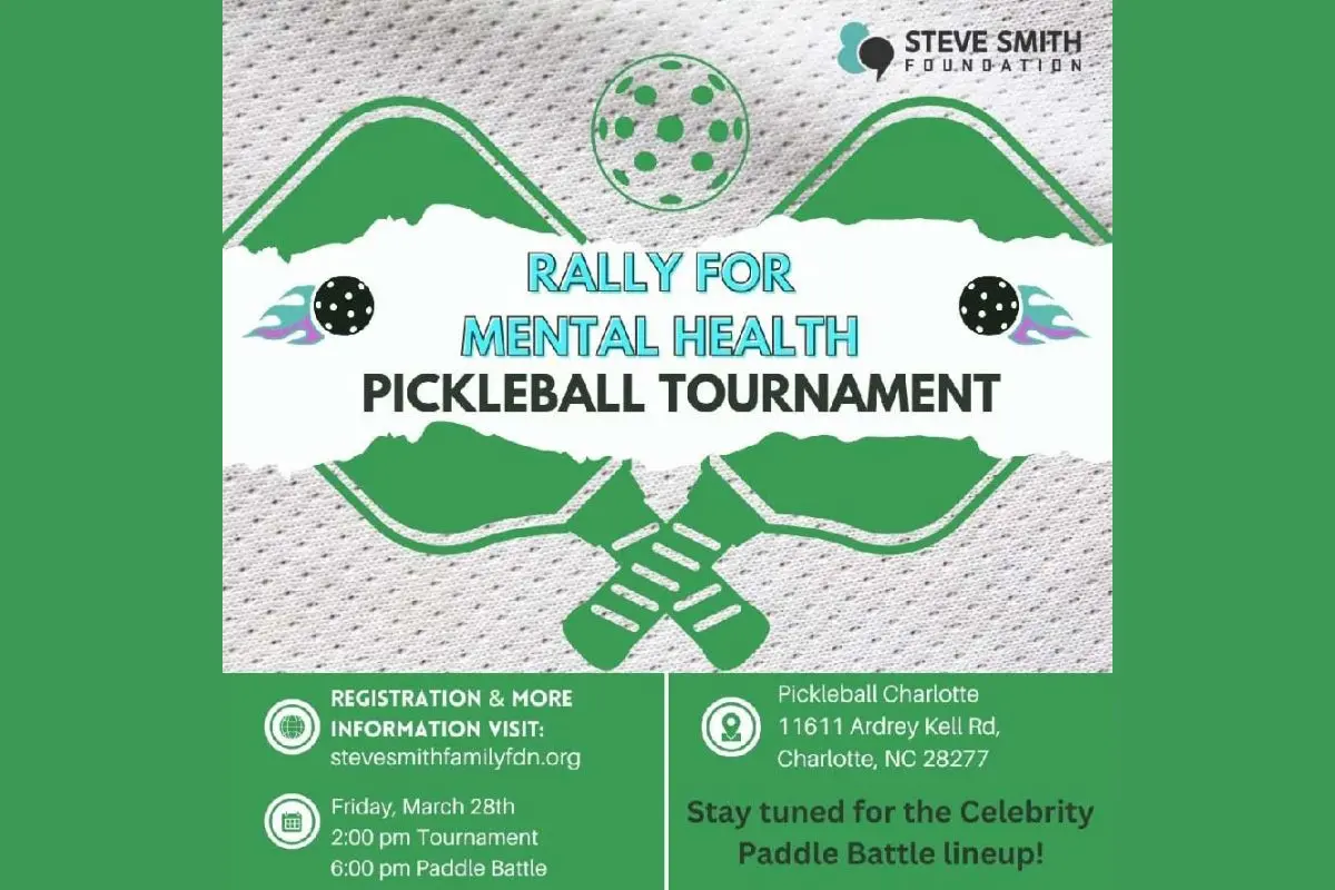 The Steve Smith Family Foundation is hosting the Rally for Mental Health Tournament on March 28, 2025. The event will take place at Pickleball Charlotte, located at 11611 Ardrey Kell Rd, Charlotte, NC, starting at 2:00 PM with a tournament, followed by a Paddle Battle at 6:00 PM. The tournament aims to raise awareness about mental health issues and promote wellness through the sport of pickleball.