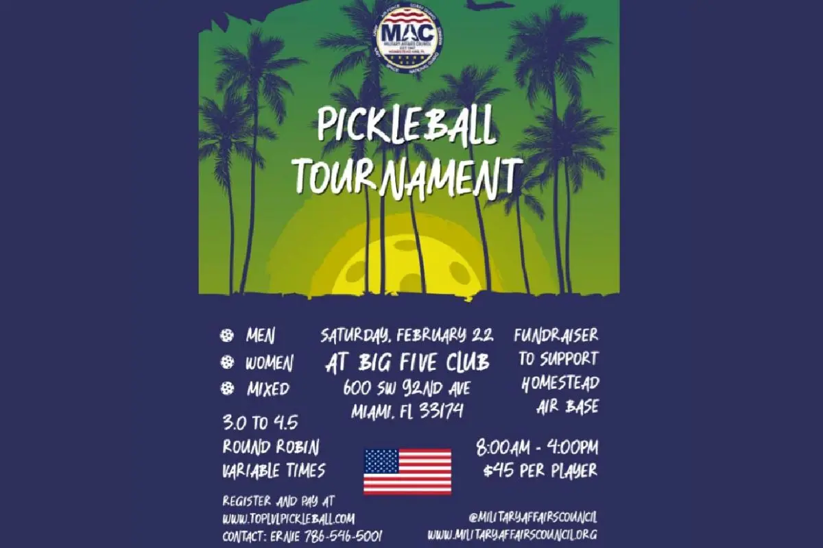 The 2nd Annual MAC Pickleball Tournament is set for February 22 in Miami. Organized by the Military Affairs Council, the event will support Homestead Air Base and feature men’s, women’s, and mixed divisions. Registration costs $45, with play running from 8:00 AM to 4:00 PM.