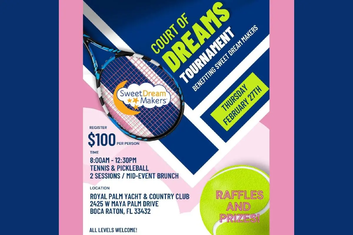 The Courts of Dreams tournament is scheduled for February 27, 2025, in Boca Raton, FL. Organized by Sweet Dream Makers, the event includes two sessions and a mid-event brunch. Registration costs $100 per person, with all proceeds benefiting the nonprofit. All skill levels are welcome.