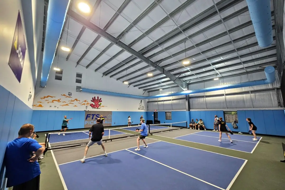 FTS Pickleball provides two indoor hard courts with permanent lines, along with portable nets for players. The facility includes amenities such as restrooms, water, and wheelchair accessibility, ensuring a welcoming environment for all. Players need a membership to access the courts, which can be reserved.