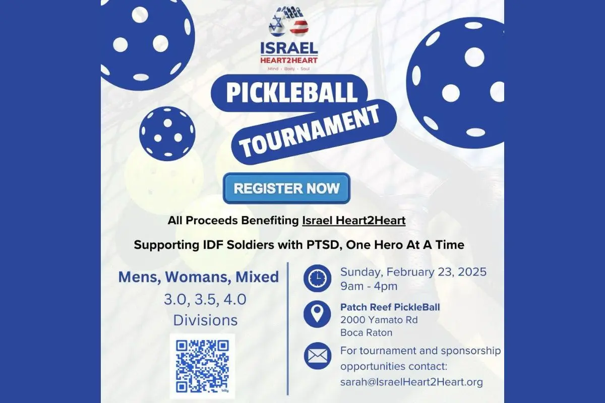The 1st Annual Israel Heart2Heart Pickleball Tournament takes place on February 23, 2025, at Patch Reef Trail in Boca Raton, Florida. Open to all skill levels, the event features Men’s, Women’s, and Mixed Doubles divisions. Proceeds will support Israel Heart2Heart’s programs benefiting IDF soldiers and their families.