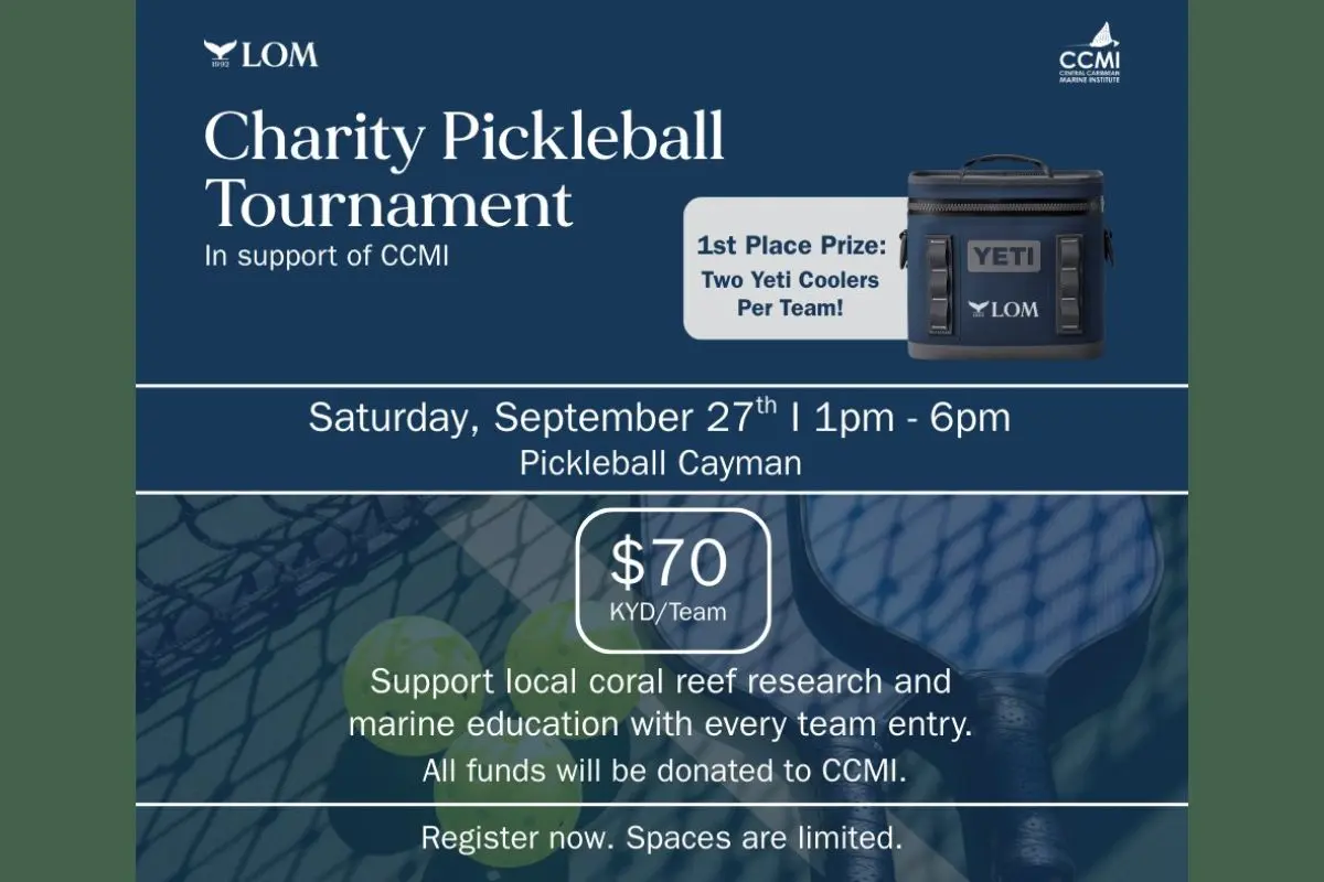 CCMI Charity Pickleball Tournament: A charity pickleball doubles tournament, sponsored by LOM Financial, will take place on September 27 from 1 p.m. to 6 p.m. at Pickleball Cayman on Smith Road. The event will raise funds for the Central Caribbean Marine Institute, with all proceeds supporting research, coral reef restoration, and marine education programs.