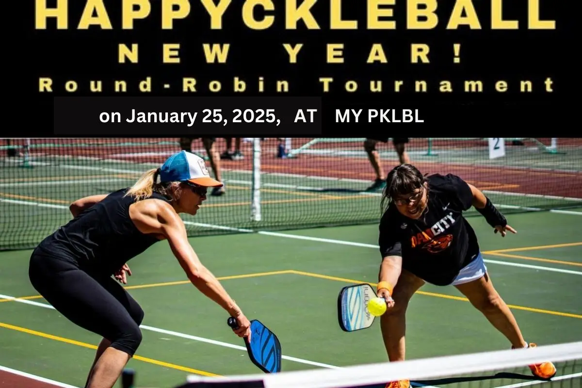 The HAPPYCKLEBALL New Year event on January 25, 2025, will take place in Fallbrook, California, at MY PKLBL. The event follows a round-robin format, with players then advancing to playoffs.