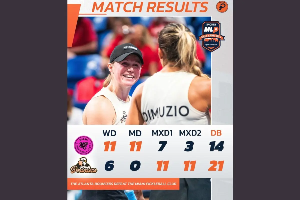 On August 2, 2025, at The Picklr in Kaysville, Utah, the Atlanta Bouncers defeated the Miami Pickleball Club 3-2. Miami won the women’s and first mixed doubles. Atlanta took the men’s doubles, second mixed doubles, and Dreambreaker 25-21 to win the match in a close Major League Pickleball battle.